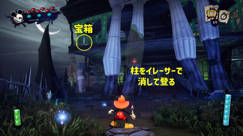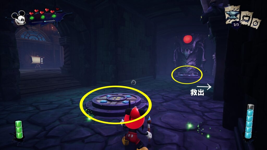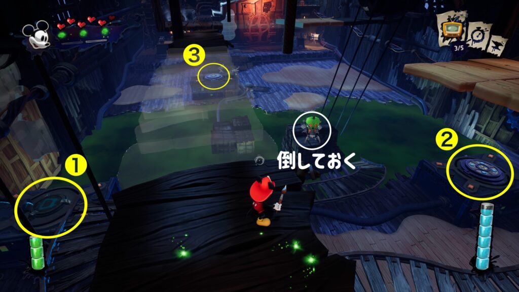 奥にいる敵(ビートルワークス)3体を倒す→下記画像○の扉が開きビートル製造機が出現するので赤いランプをイレーサーで消す