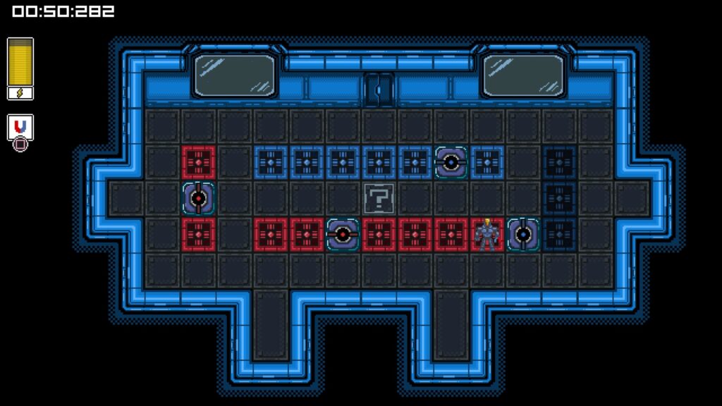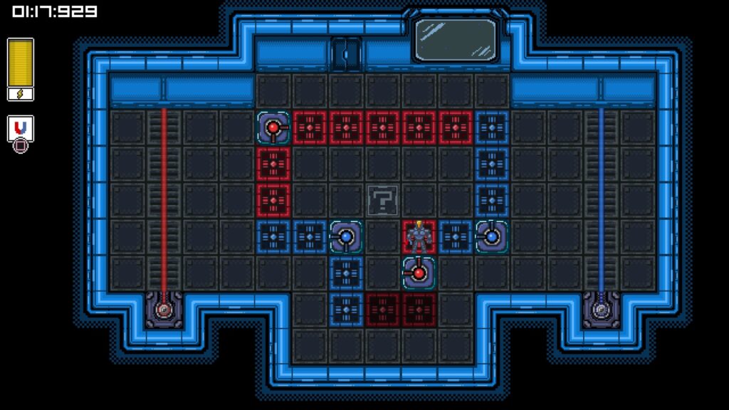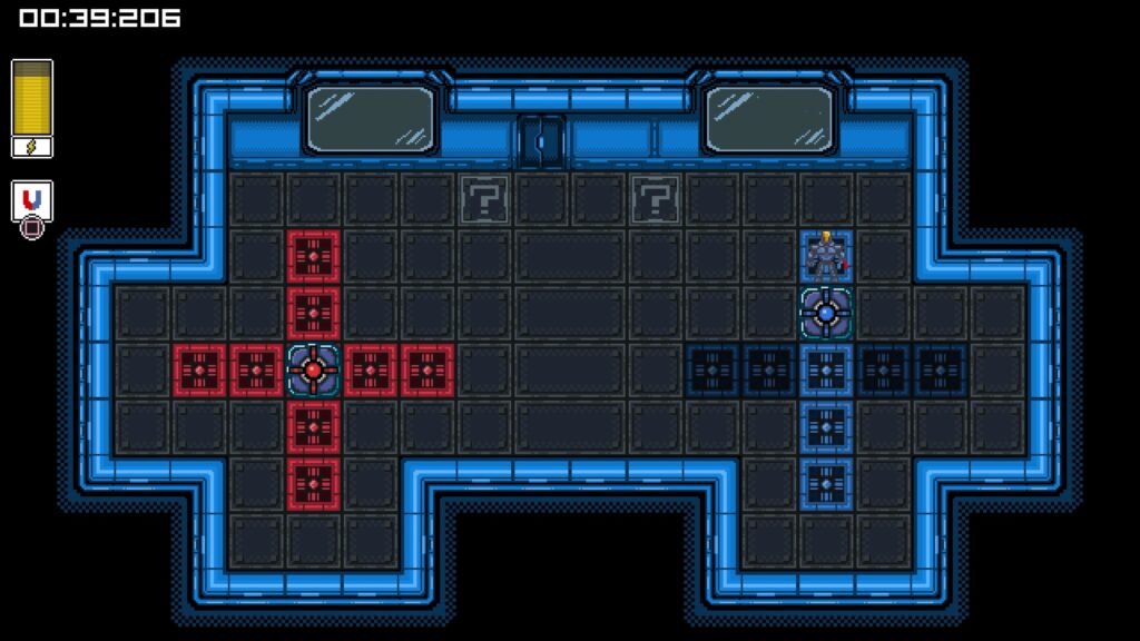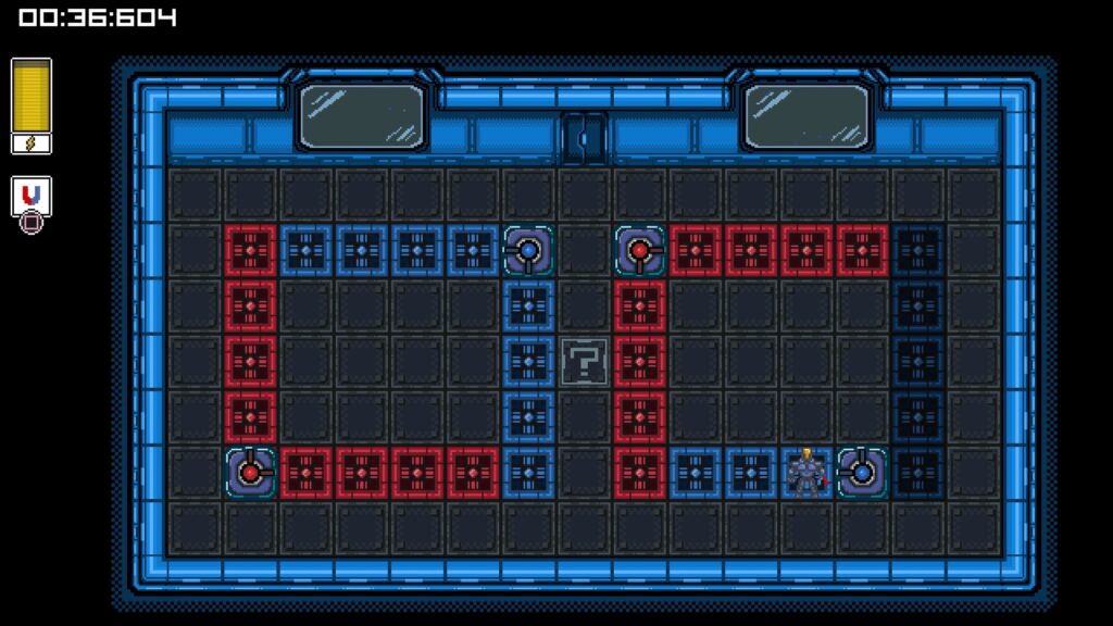 ヒントを読む。箱を左のレーザーに当てて出力状態にする。◻︎で箱を引く